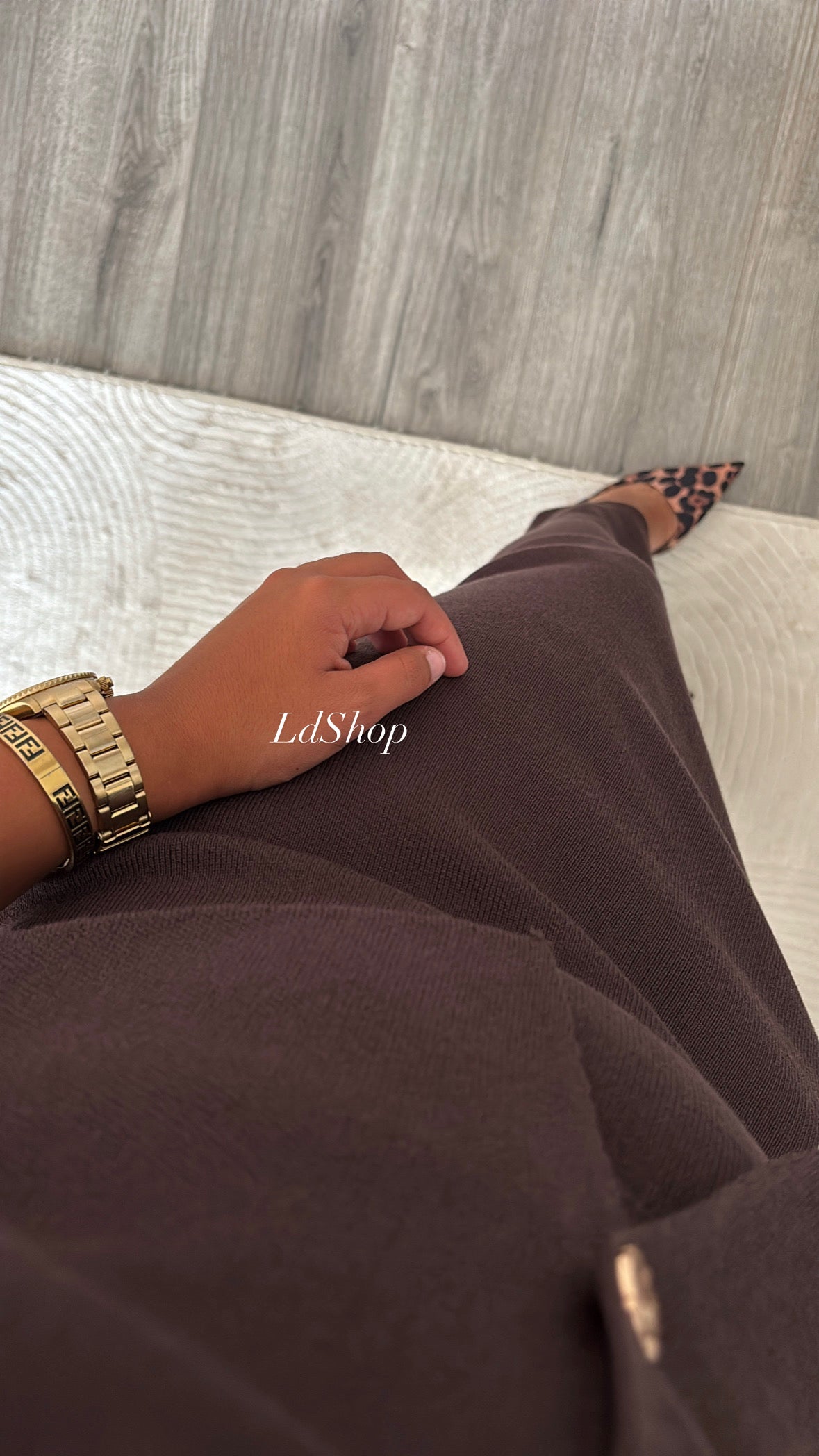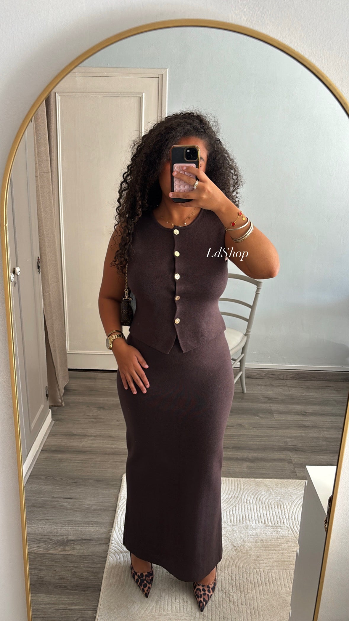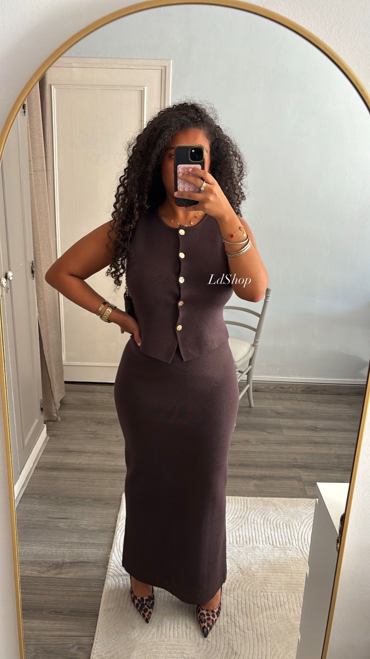 Ensemble en maille marron avec haut à boutons dorés et jupe longue. La longueur de la jupe convient parfaitement aussi bien aux grandes qu'aux petites.