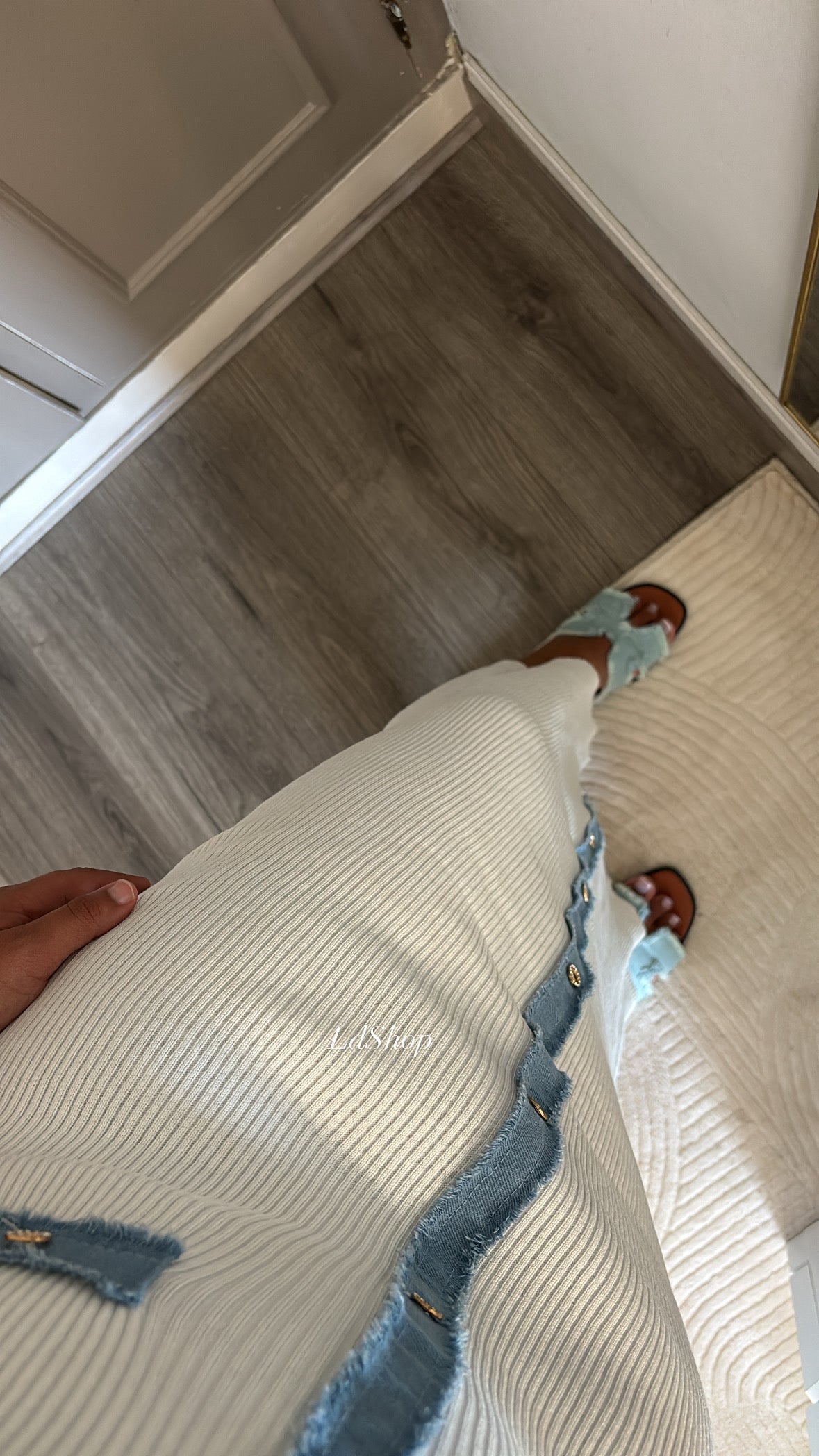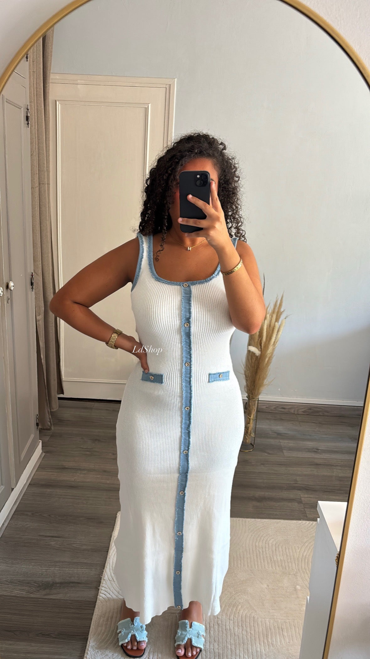 Robe longue blanche en tissu côtelé, parfaite pour l’été. Avec ses détails en jean et ses boutons à strass, elle met en valeur la silhouette.